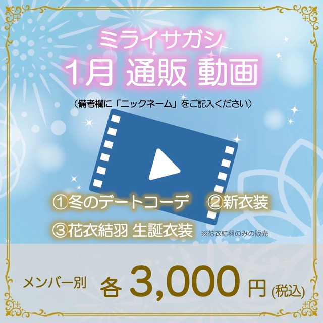 購入者様へ向けた約20秒間の動画を販売します。 登録されたメールアドレスへギガファイル便にてお送りします。 販売期間:1/28(水)15:00まで [③花衣結羽 生誕衣装]は花衣結羽のみの販売となります。 ※購入する際は備考欄へニックネーム、Xアカウント名(任意)をご記載ください。 :+:-:+:-:+:-:+:-:+:-:+:-:+:-+:-+: ⚠️ご購入についてのお願い ☑︎動画は購入時に入力いただいた、メールアドレス宛にギガファイルでお送りいたします。 ☑︎ 動画は「[email protected]」から送信させていただきます。お手数をおかけしますが、上記メールを受信できるように、迷惑メール設定から解除、もしくは受信設定をしていただくようお願いいたします。 ☑︎未入金はキャンセルとなります。何卒、入金期日にはお気をつけくださいますようお願いいたします。 ☑︎価格はそれぞれ1枚、または1データとなります。